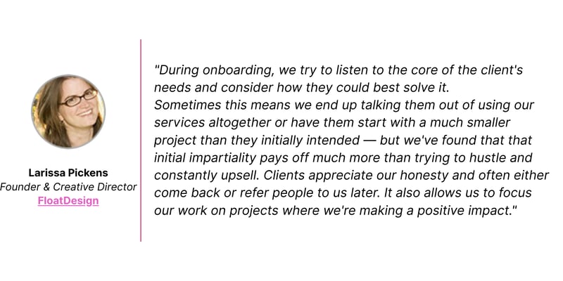 Takeaway: Successful onboarding depends on a free and transparent exchange of information. Clients should be able to ask you anything, and vice versa. Your entire team across departments should know exactly what the client’s business does and how it operates.